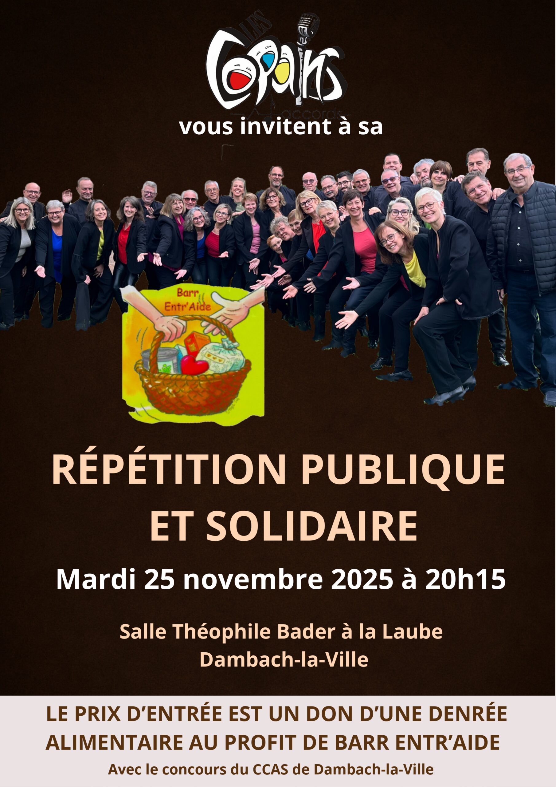 Les Copains répètent… et partagent ! Quand ? Mardi 25 novembre à 20h15 Où ? Salle Théophile Bader – Dambach-la-Ville L’entrée ? Un don alimentaire pour Barr Entr’Aide Venez découvrir les coulisses musicales dans une ambiance conviviale et solidaire. On vous attend nombreux pour faire du bruit… et du bien